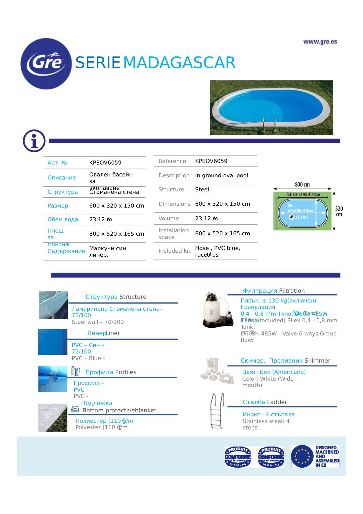 Басейнът е с размери 600x320 см и дълбочина 150 см. Идеален за малки пространства и дворове и се монтира много бързо. Басейнът позволява вграждане до ръба, при което басейнът и околният простор са на една линия, а не по-високо, както при повечето басейни, които твърдят, че са за вграждане.