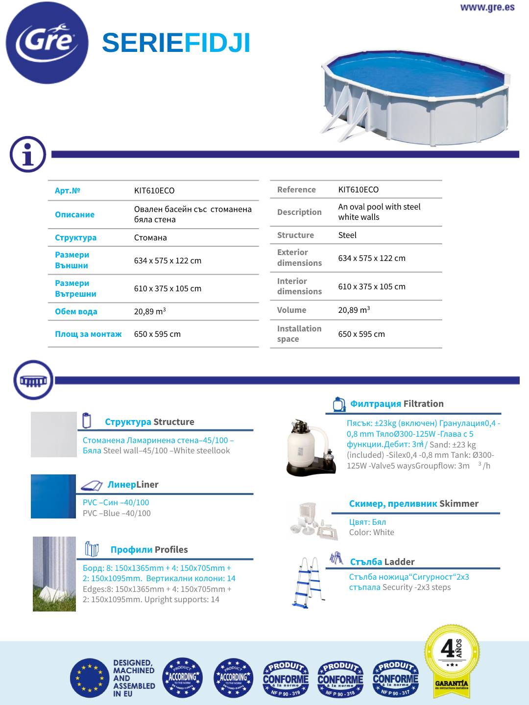 - Пълен комплект с пясъчен филтър, помпа и стълба