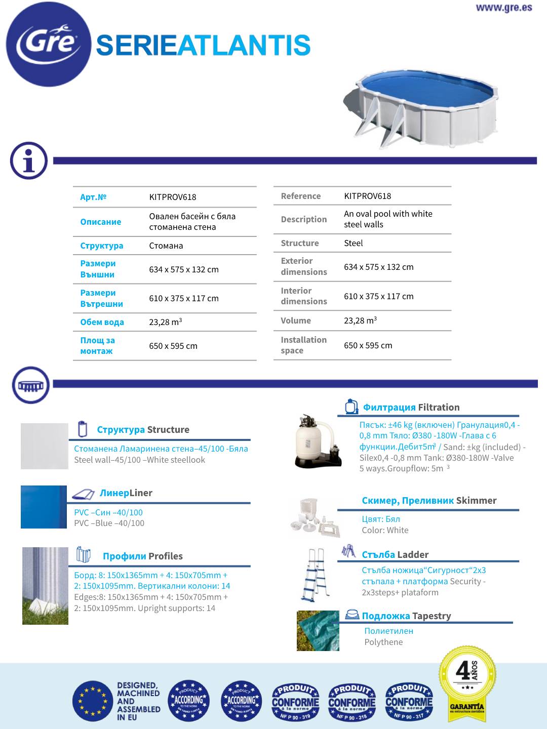 Потопете се в комфорта и лукса на басейн KITPROV618, създаден с овална форма за истинските ценители на плуването. Този басейн се отличава със стабилна конструкция, усилени странични подпори и широк борд, гарантиращи ви безпроблемни моменти на наслада и отдих.
