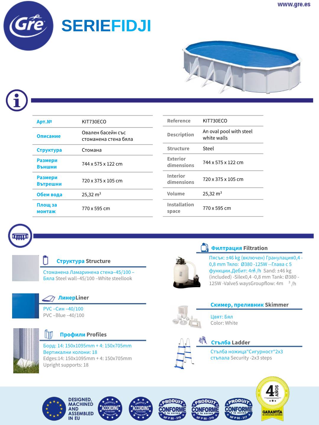 Потопете се в удоволствието от плуване с басейн KIT730ECO - перфектното решение за обичащите водните забавления. Този овален басейн се отличава със стабилна конструкция, подсилени странични подпори и широк борд.