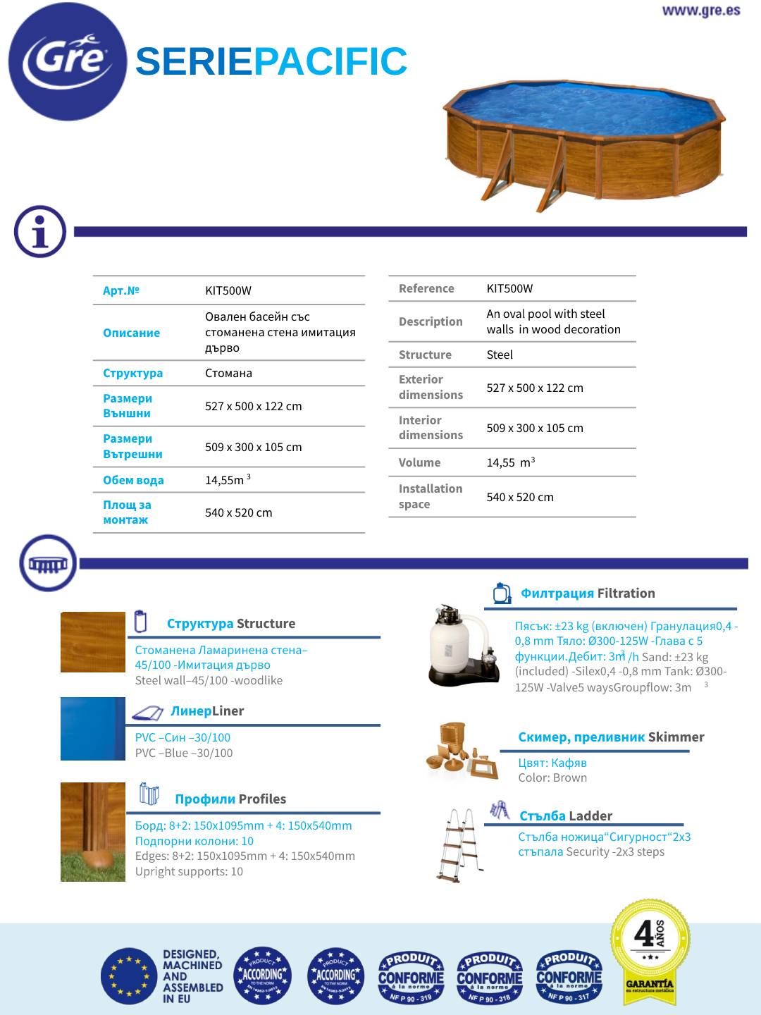 Басейнът KIT500W не само предоставя възможност за спорт и забавление, но и придава стил и хармония на вашия двор. Имитацията на дърво придава уникален външен вид, интегрирайки се перфектно в заобикалящата среда.