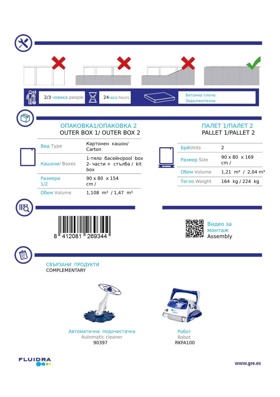 Басейнът е опакован от 2 части с размери 120х80х170 см. Тегло 388 кг.